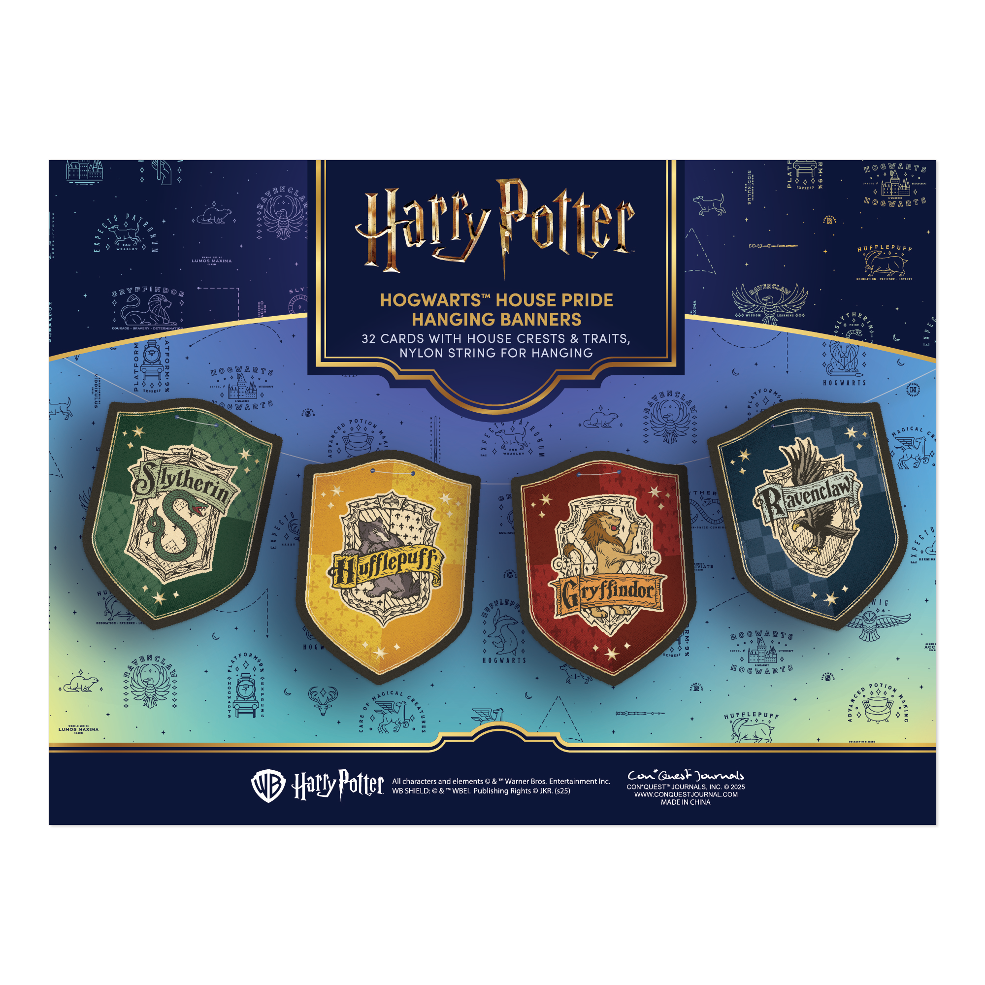 All Hogwarts Houses are welcome! Celebrate Gryffindor, Slytherin, Hufflepuff, and Ravenclaw with this Officially Licensed Harry Potter House Pride Hanging Banner. Vintage-style crests on the front and House traits on the back make it perfect for any fan.